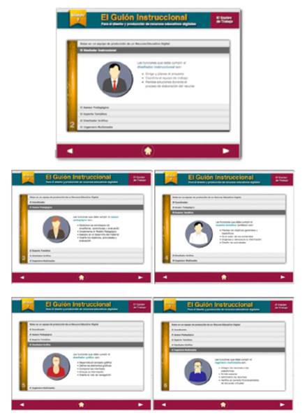 En el módulo 3, equipo de trabajo, se describen los diferentes roles y sus funciones en la construcción de un RED. En este punto, el docente identifica sus funciones como experto temático y comprende la importancia del guion instruccional. Así mismo, el docente identifica las funciones de los demás roles y participación en la construcción de un RED (ver figura 7).