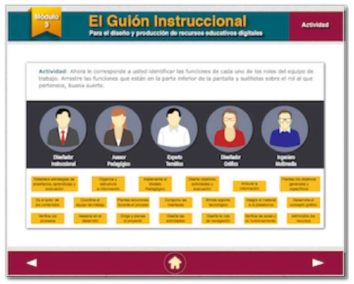 En la pantalla 2, del módulo 3, se incluye una actividad interactiva en la que el profesor debe identificar y relacionar las funciones de cada rol (ver figura 8). En la parte superior se encuentran los personajes que representan cada rol, en la parte inferior se organizan de manera aleatoria las funciones de todos los roles. El objetivo de esta actividad es identificar cuáles funciones corresponden a cada rol.