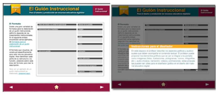 En la página 3 y 4 del módulo 4, se exponen dos ejemplos del guion instruccional de este RED; se inserta una imagen de la pantalla para que el profesor la identifique y la relacione con la información incluida en el formato del guion instruccional; al ubicarse sobre cada una de las áreas del formato la imagen se maximiza para que el profesor lea cómo se elaboró cada ítem.