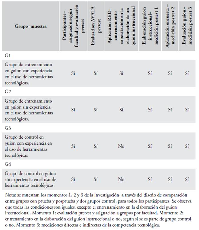Para el diseño de la investigación, se utilizó un diseño de comparación entre grupos con prueba y posprueba y dos grupos control (Hernández-Sampieri, Fernández-Collado, & Baptista-Lucio, 2006). El diseño fue una variación de un diseño de comparación entre grupos y un grupo control. No se planteó como un estudio de tipo experimental. Su medición fue de corte transaccional o transversal (aplicación o exposición al RED, o entrenamiento en la elaboración del guion instruccional). El diseño no tuvo alcances experimentales, debido a que no se pudo establecer una relación causal entre ser expuesto al RED y el posterior desempeño del guion; sin embargo, se pudo anticipar que estar expuesto al RED facilitaría la elaboración del guion instruccional y, por ende, en mediciones indirectas, el adecuado desempeño de AVATA.