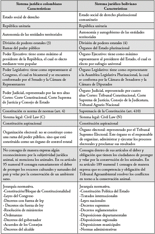 A partir de todos los pasos realizados anteriormente, se hace necesario manifestar que los sistemas jurídicos de Colombia y de Bolivia tienen un núcleo esencial sustancial-mente similar en donde se vislumbra que al interior de estos existe cierta similitud en cuanto al sistema legal que manejan y la jerarquía normativa que utilizan. Por lo anterior, se evidencia que a causa de estas similitudes se determinó que los sistemas jurídicos en cuestión son susceptibles de ser comparados y analizados, pues guardan cierta correspondencia que permite entenderlos en un sentido similar y que hace que su contrastación se lleve de manera adecuada y específica lo cual otorga una mayor facilidad a la hora de analizar las similitudes y diferencias que se encuentran en la totalidad de estos sistemas jurídicos.