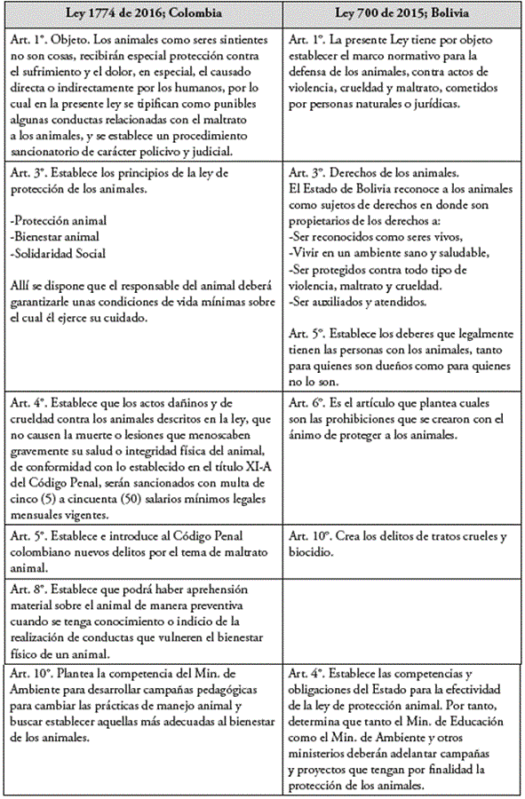 De las legislaciones anteriormente citadas, se puede observar que el tratamiento legal que otorgan las leyes al tema animal parece no variar mucho, sin embargo, si articulamos todo el sistema jurídico del país boliviano y lo contrastamos con el sistema jurídico colombiano, nos encontramos con que el primero tiene un desarrollo legal mucho más profundo centrado en la prevención del maltrato animal, mientras que la legislación colombiana centra su esfuerzo en el castigo de las conductas que atenten contra la integridad animal, otorgando una protección que no es ideal, pues se ha edificado desde la óptica humana sin tener en cuenta que el contexto en el cual se desarrolló esta ley fue en un ambiente de populismo punitivo.