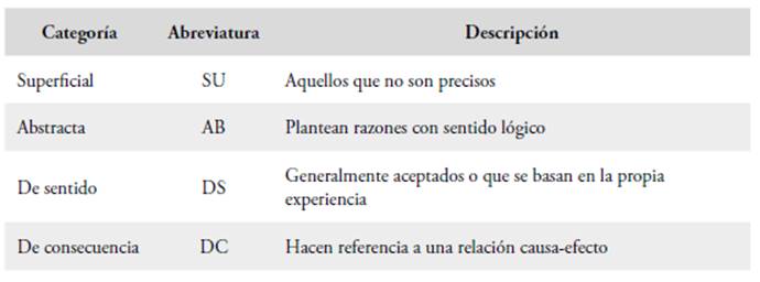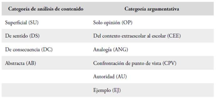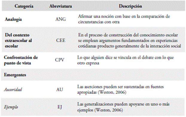 En este estudio se privilegian las categorías argumentativas planteadas por Candela (1991): analogía, del conocimiento extraescolar al escolar y confrontación de punto de vista. Se establece además una relación con el modelo de la calidad de los argumentos planteado por Sampson y Clark (2009), conformado por las siguientes categorías: superficial, de sentido, de causa-consecuencia y abstracta.