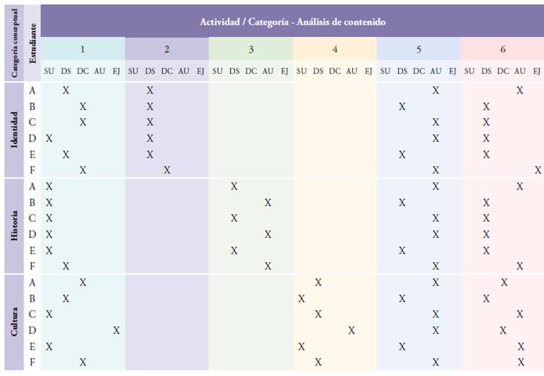 Finalmente, en la actividad 6, o postest, los estudiantes A y F fundamentaron su definición de identidad en fuentes documentales u orales, planteando argumentos abstractos (AB) y utilizando como estrategia la autoridad (AU). Los estudiantes B, C, D y F, por su parte, utilizaron el conocimiento y la experiencia adquirida en su contexto inmediato emitiendo argumentos DS y apoyándolos en la relación entre el contexto extraescolar y el escolar (CEE).