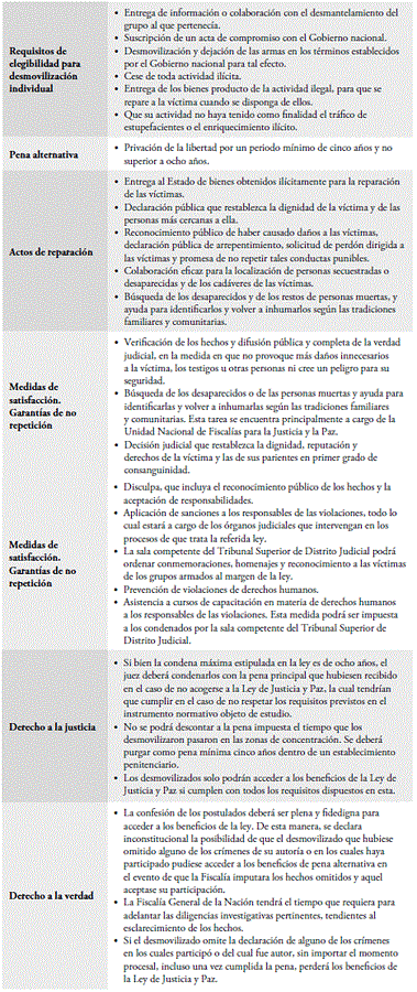Como resultado de las negociaciones con las AUC, se obtiene la denominada Ley de Justicia y Paz, cuyos puntos más relevantes se presentan en la tabla 1.
