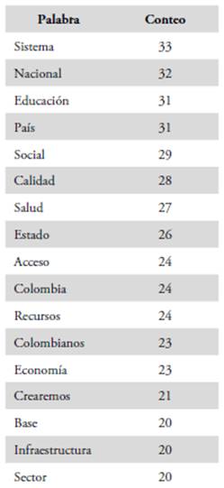 La garantía de los derechos de las comunidades desde la perspectiva de género es un asunto que preocupa en razón del nuevo periodo presidencial. Ante esto, se revisaron las propuestas de campaña de electo presidente Iván Duque y se notó la ausencia de medidas claras para las mujeres y la comunidad LGBTI. El análisis de frecuencia de palabras del documento revela la poca preocupación al respecto (tabla 10).