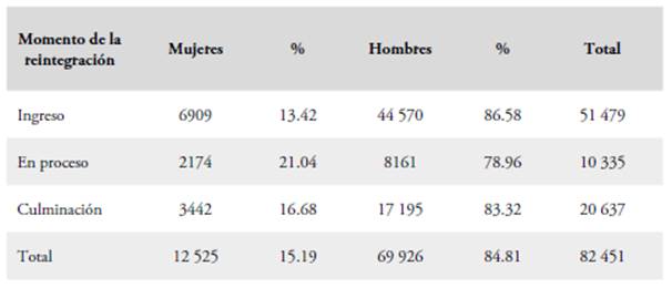Como se evidencia, los porcentajes de mujeres participando en los diferentes momentos de la reintegración no son despreciables, lo que muestra la necesidad del enfoque de género en el análisis de los acuerdos de paz que suscriba el Gobierno nacional de turno con los diferentes grupos armados al margen de la ley. Lo anterior es apoyado por la caracterización de las comunidades farianas en las zonas veredales realizada por la Universidad Nacional de Colombia (2017), en la cual se encuentra que 2267 excombatientes (el 23 %) son mujeres.