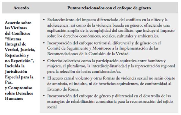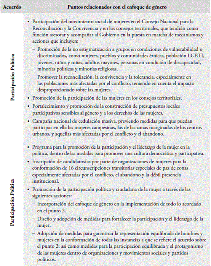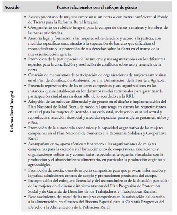 Buscando no caer en los errores de procesos de paz anteriores y extranjeros, el Acuerdo Final firmado entre las FARC-EP y el Gobierno nacional es ejemplo de la inclusión de la perspectiva de género como garantía de los derechos de las mujeres y la lucha por la equidad entre sexos. Eso no se había presentado en anteriores aproximaciones de paz entre el Gobierno y las guerrillas, por lo cual su inclusión resulta ser un avance significativo para el cumplimiento y la garantía de los derechos de las mujeres. A continuación se describe cómo se incluyó dicha perspectiva según cada uno de los puntos acordados entre las partes, evidenciando su potencial beneficio para mujeres tanto civiles como excombatientes (ONU Mujeres, 2017).