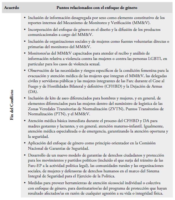 El fin del conflicto fue otro de los puntos del Acuerdo Final y tuvo como objetivo el establecimiento de los parámetros y condiciones para la terminación de las hostilidades y el cumplimiento de lo pactado. Entre los puntos relacionados con los derechos de las mujeres excombatientes se encuentran los reseñados en la tabla 5.
