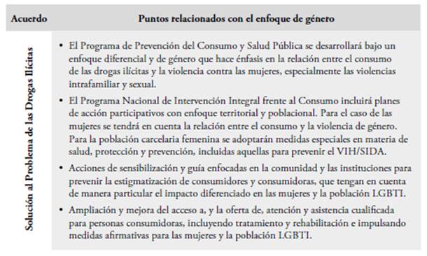 El punto 4. relacionado con la solución del problema de los cultivos ilícitos, plantea estrategias que promueven intervenciones de salud pública para enfrentar el consumo, incluyendo y reconociendo el impacto diferencial de aquellas en las mujeres y proponiendo estrategias en esta línea.