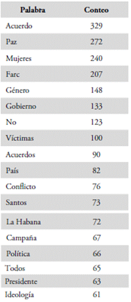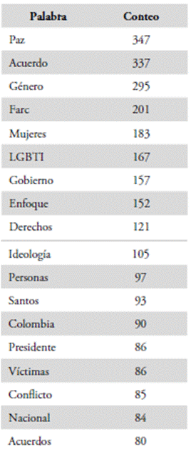 Como se evidencia, entre los temas más frecuentes están los relacionados con mujeres y enfoque de género, así como alusiones a la comunidad LGBTI. Asimismo, son múltiples los pronunciamientos que hacen alusión a la "ideología de género" por parte de voceros de la campaña del no o personajes que se oponían rotundamente al acuerdo de paz alcanzado. Algunas de las afirmaciones emitidas se exponen a continuación: