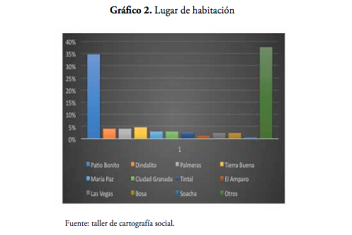 Los barrios de mayor asentamiento de las familias de los niños son Patio Bonito, Tierra Buena, Dindalito, Palmeras y María Paz; los de menor asentamiento corresponden a los barrios Margaritas, Bellavista, Kennedy Central, Santa Mónica, Roma y Mandalay, entre otros (véase el gráfico 2). La información obtenida es clave en el sentido de que, al relacionar los datos del mapa y los de habitación la zona, se obtiene una de las más inseguras y vulnerables de la localidad.