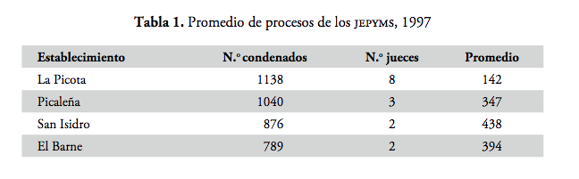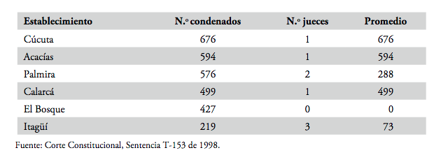 Estos despachos judiciales tienen desde su origen una elevada carga laboral. Obsérvese el caso de Tunja: en 1994, el juzgado primero de ejecución de penas y medidas de seguridad contaba con cinco funcionarios para conocer del trámite de la ejecución de la pena de los privados de la libertad en la penitenciaría de El Barne y Tunja, que después se fue ampliando a los otros centros penitenciarios del circuito judicial de Tunja. En 1997, se contaba ya con dos juzgados y, según la Corte Constitucional, en la penitenciaría nacional de El Barne estaban privados de la libertad 789 condenados y cada uno de los jueces tenía competencia sobre 394 procesos (véase la tabla 1). De este mismo modo, se refieren los casos de todos los jepyms en el país en cuanto a su carga laboral, pues les corresponde una carga anual de 39 839 procesos (Corte Constitucional, T-153 1998).