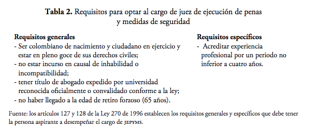 Pese a lo anterior, el jepyms está considerado en la Constitución Política y la ley como el garante de la condición de ser humano de las personas privadas de la libertad y, por ello, el funcionario que desempeñe ese cargo debe cumplir con unos requisitos mínimos para acreditar su idoneidad para el cargo (véase la tabla 2).