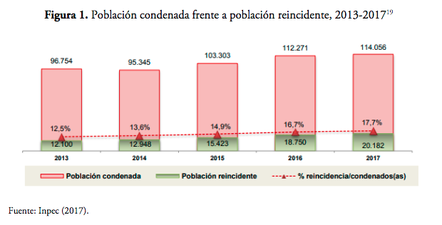 La anterior gráfica muestra la cifra de reincidencia desde el año 2013 al 2017 frente a la población condenada privada de la libertad que ha promediado entre 12 100 a 20 182 las personas que incursionan nuevamente en el delito, que en lugar de disminuir por el contrario año a año aumenta esta población.