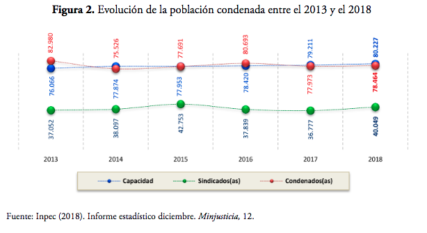 Por información reportada por el Consejo Superior de la Judicatura, se sabe que en el país existen 155 juzgados de ejecución de penas y medidas de seguridad que deben atender desde el 2013 hasta el 2018 una población reclusa de entre 82 980 y 78 464 condenados (Consejo Superior de la Judicatura. Sala Administrativa, s. f.). Las estadísticas del Inpec del 2018 reflejan esa realidad (véase la figura 2), que la convierte en un aspecto negativo para el preso que pretenda alcanzar su resocialización. A ello se suma la tasa de hacinamiento que se viene registrando desde 1998, cuando la Corte Constitucional declaró por primera vez el estado de cosas inconstitucional en los centros penitenciarios y carcelarios del país. Pese a las medidas ordenadas, aún hoy se continua con la misma problemática, no obstante, las ordenes emitidas en la sentencia T-388 del 2013 y T-762 del 2015, que nuevamente declararon el estado de cosas inconstitucional de los centros carcelarios y penitenciarios del país.
