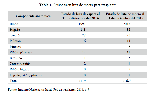 El Ministerio de Salud (2016) a través de su campaña “Déjalo conversado” señala que existen en Colombia aproximadamente 2029 personas a la espera de un trasplante de órganos; así mismo, durante el 2015 se hicieron 1204 procesos de trasplantes (incremento del 14 % frente al 2014) y hubo un total de 405 donantes reales, con un incremento del 17 % frente al año anterior. Respecto del consentimiento familiar, 60 % de las familias entrevistadas manifestaron su aceptación, y hubiera sido posible salvar aproximadamente 500 vidas más si el 40 % restante hubiese aceptado la realización del trasplante.
