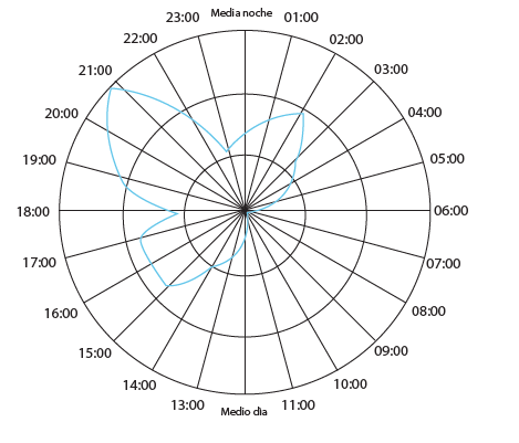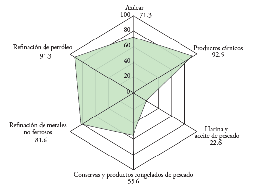 Gráfico radial: compara los valores agregados de cada serie de datos. Cada eje se utiliza para indicar el valor de un indicador específico. Regularmente se representan indicadores distintos con valores previamente estandarizados para fines de comparación.