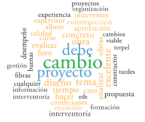 Nube de palabras: se encargan de representar un conjunto de datos no estructurados que no tienen asociados valores numéricos. La construcción de este tipo de gráfico se basa en el conteo de palabras que se repiten; la palabra con mayor cantidad de coincidencias va aumentando de tamaño y cambiando de color. El siguiente ejemplo está basado en las palabras encontradas en un foro de discusión de un aula de aprendizaje virtual.