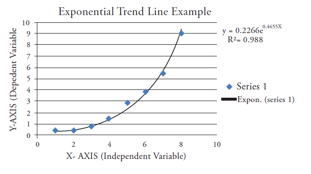 Línea de tendencia exponencial: línea curva que resulta muy útil cuando los valores de los datos aumentan o disminuyen a intervalos cada vez mayores. No es posible crear una línea de tendencia exponencial si los datos contienen valores cero o negativos. La condición para obtener este tipo de tendencia consiste en que los valores de los datos aumenten o disminuyan a intervalos cada vez mayores.