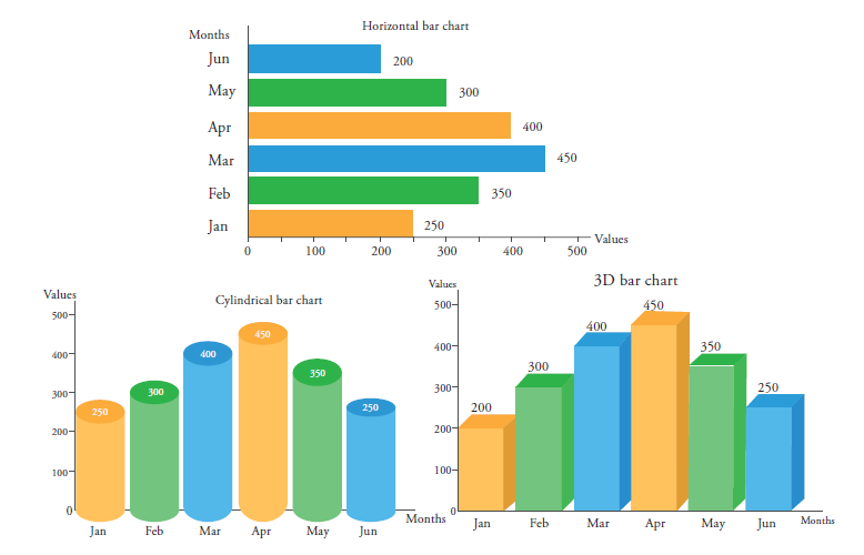 Gráficos de barras: se utilizan para comparar datos entre categorías. Son el resultado de combinar dos variables a través de los ejes . y .. Estos gráficos se crean utilizando modelos en dos y tres dimensiones, según el objetivo del gráfico. Adicionalmente, este tipo de gráficos pueden presentarse de manera vertical u horizontal. Se utiliza la forma horizontal para situaciones en las que se tiene una gran cantidad de categorías que se requieren comparar, organizadas de mayor a menor con diferente color para facilitar la lectura del gráfico.