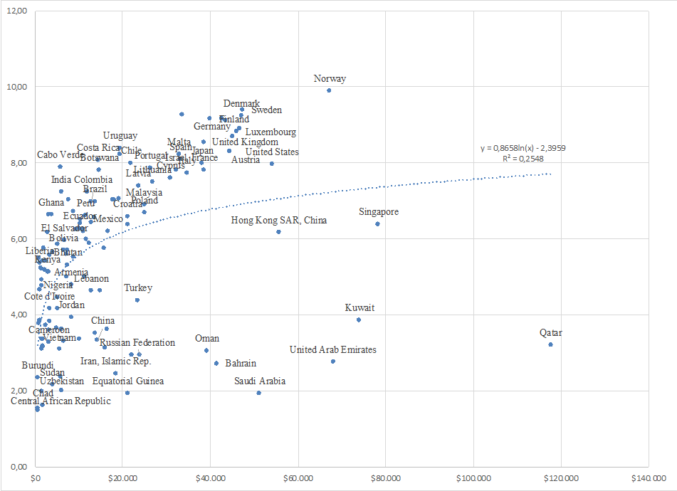 A partir de lo anterior, al examinar los ingresos de los países del mundo y el índice de democracia1, en la Figura 3 se aprecia claramente que los países con mayor renta PIBPC (más de USD 20 000 en el 2016) son aquellos que poseen un índice de democracia mucho más elevado. Por ende, son más los casos concentrados en esta combinación. Sin embargo, cabe señalar que algunos países con un elevado PIBPC ―como Catar, Emiratos Árabes Unidos, Baréin, Kuwait, Arabia Saudita y Omán― tienen, en su mayoría, un nivel de ingresos elevado a causa del petróleo y un índice de democracia bajo, por eso están en los niveles de la autocracia, ya que dichos países están gobernados por dictaduras revestidas en algunos casos con el nombre de democracia constitucional o monarquía absolutista. De todos modos, no se puede establecer una relación explicativa con estas dos variables, pues el coeficiente de determinación es de 0.254 en la regresión logarítmica lineal, lo cual es bastante débil. En consecuencia, es difícil determinar con solo dos variables la causalidad de la democracia a través del PIB y viceversa.