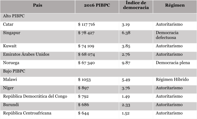 Es difícil conceptual y metodológicamente encontrar una relación entre las variables. En cualquier caso, como se observa en la Tabla 1, al revisar los cinco países con mayores PIBPC del mundo se puede apreciar que solo se encuentran dos democracias y el resto son regímenes autoritarios. Esto muestra que el crecimiento económico no se debe simplemente a poseer una democracia como forma de gobierno, pero sí es bastante relevante que ninguna democracia plena se encuentra en subdesarrollo. Así pues, cuando revisamos las cinco economías de menor PIBPC, se encuentra que todas son regímenes autoritarios y no aparece ninguna democracia. Es decir, se puede inferir que la democracia es una característica necesaria mas no suficiente para los países desarrollados que no dependen de reservas de petróleo y, por tanto, una democracia plena no se encontrará dentro de los países con bajos niveles de crecimiento económico.
