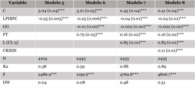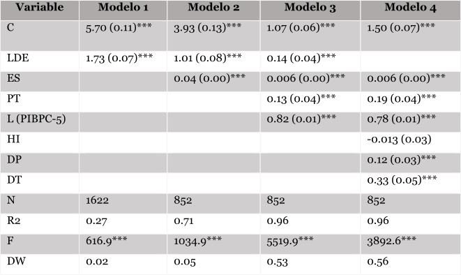 Tabla 2. Regresiones del desempeño económico (variable dependiente LPIBPC)