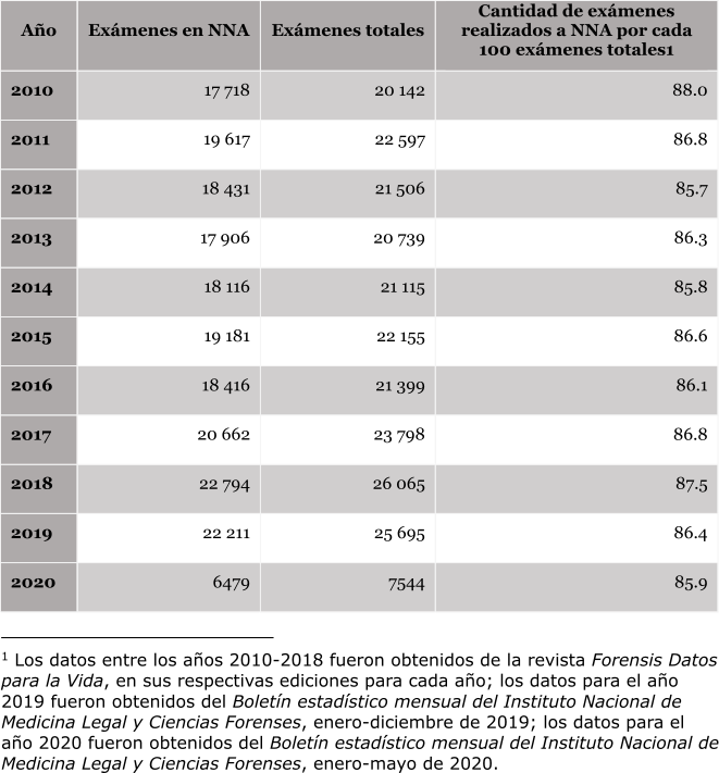 Dentro de las cifras reportadas por el INMLCF, la ocurrencia de conductas delictivas en contra de NNA es alarmante, con una incidencia arriba del 85 % en todos los años y de manera constante, pues las víctimas principales de estos actos son los menores del país. La permanente ocurrencia y registro de estos actos tiene tales proporciones que de cada 100 exámenes médico-legales por presuntos delitos sexuales en el año 2010, 88 de ellos fueron realizados a NNA, y que en 2019 esta cifra fue de 86.4, lo cual evidencia que las políticas en contra de estos actos están lejos de triunfar.