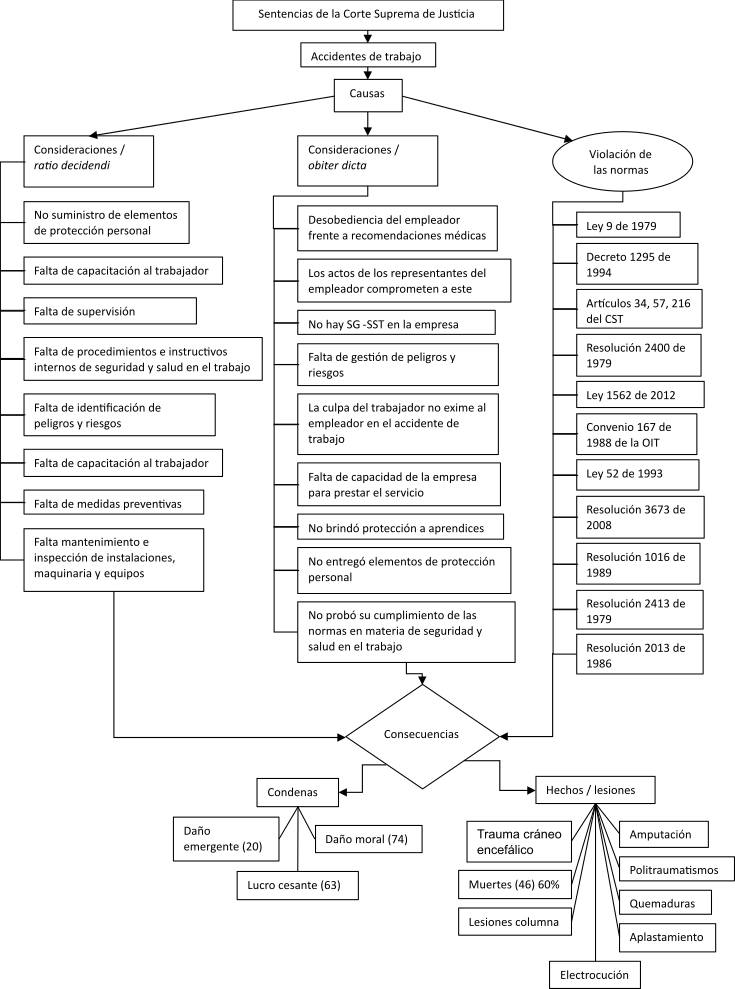 En la figura 1 se hizo una aproximación a la interpretación global de todos los resultados, haciendo una interrelación de los hechos, consideraciones, los resuelve y normas jurídicas en las que, finalmente, argumentan la decisión de la culpa patronal por accidente de trabajo.