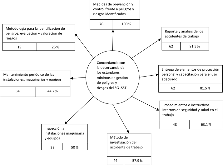 En la figura 2 se mostró que, al comparar las consideraciones de las sentencias y el porcentaje de observancia de los jueces sobre el cumplimiento por parte de los empleadores, con referencia a las obligaciones en riesgos laborales de la normatividad anterior mencionada con los estándares mínimos específicos en gestión de peligros y riesgos del Sistema de Gestión de Seguridad y Salud en el Trabajo (SG-SST) (Resolución 0312 de 2019), se encontró similitud, correlación y concordancia.