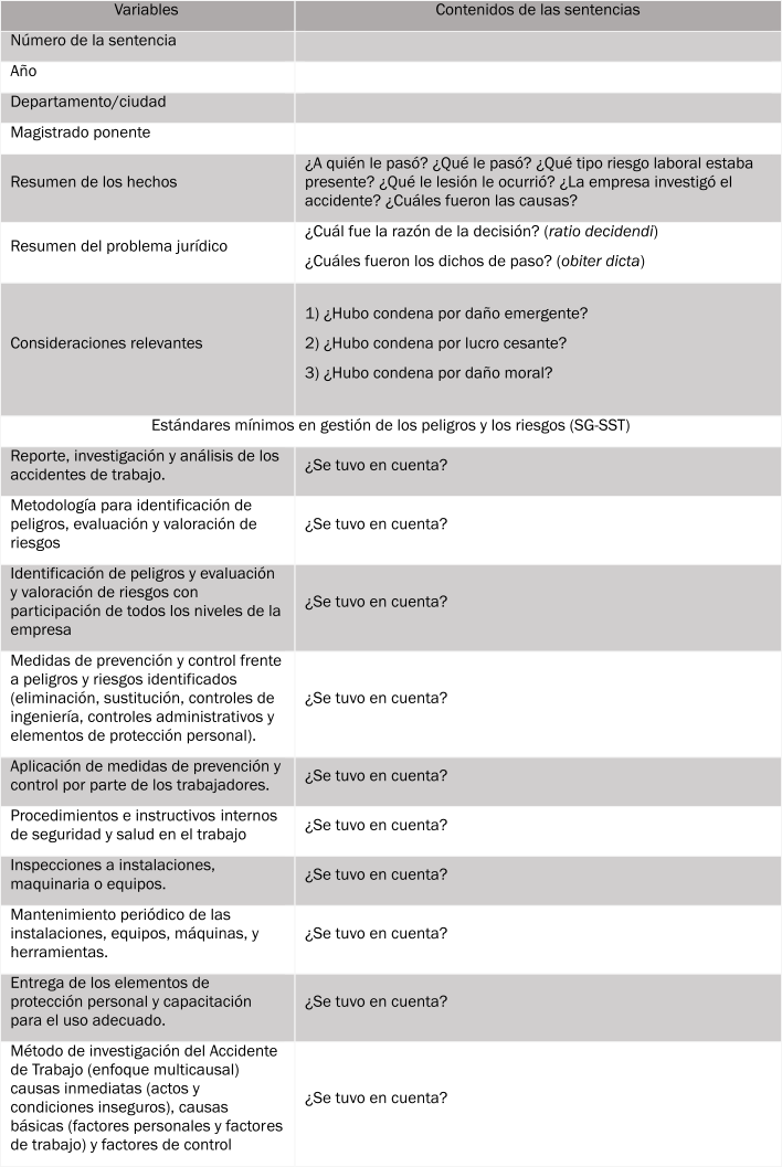 También, para este proceso, se realizó una revisión documental, en la que la unidad de análisis son todas las sentencias de culpa patronal en accidentes de trabajo del sector privado, puntualmente las condenatorias por la Corte Suprema de Justicia en la Sala de Casación Laboral. Además, se utilizaron técnicas de revisión sistemática exploratoria, mediante un protocolo de búsqueda con criterios de selección como condena por culpa patronal en accidente de trabajo (2019 y 2020), sector privado y Sala de Casación Laboral. Se usó una matriz para la recolección de información, en la que se sistematizaron los contenidos de las sentencias con las siguientes variables: número de la sentencia, tipo de sentencia, año, magistrado ponente, corte o tribunal, hechos, problema jurídico, consideraciones más relevantes y resuelve. También, las variables concernientes a seguridad y salud en el trabajo a la luz de la Resolución 0312 de 2019, como los estándares mínimos señalados en la gestión de los peligros y riesgos del Sistema de Gestión para la Seguridad y la Salud en el Trabajo, como las medidas de prevención y el control frente a los peligros y riesgos identificados (eliminación, sustitución, controles de ingeniería, controles administrativos y elementos de protección personal), aplicación de medidas de prevención y control por parte de los trabajadores, procedimientos e instructivos internos de seguridad y salud en el trabajo, inspecciones a instalaciones, maquinaria o equipos, mantenimiento periódico de las instalaciones, equipos, máquinas y herramientas, entrega de los elementos de protección personal y capacitación para el uso adecuado y método de investigación del accidente de trabajo (enfoque multicausal), causas inmediatas (actos inseguros y condiciones inseguras), causas básicas (factores personales y factores de trabajo) y factores de control (Resolución 0312, 2019, pp. 20-21).