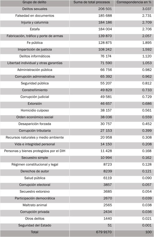 Como se puede observar en la tabla, las 1155 conductas punibles mencionadas fueron asociadas en un total de 41 grupos de delitos para lograr una mayor facilidad de análisis y comprensión. En términos generales, durante este periodo se registraron un total de 6 799 170 delitos a nivel nacional, siendo el hurto el delito más cometido, ya que corresponde a un poco más de la cuarta parte del total.