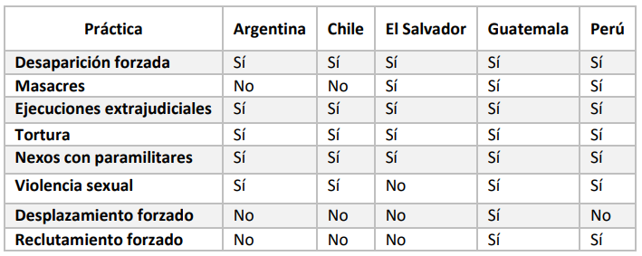 Estos casos van a ilustrar cómo los militares, bajo la premisa de garantizar la seguridad nacional en la lucha antisubversiva y anticomunista, cometieron abusos que se convirtieron en prácticas comunes y generalizadas de violaciones sistemáticas a los derechos humanos ( Bueno, 2016). En la siguiente tabla se puede evidenciar las principales practicas atribuidas a los actores militares en los países donde las CV ya realizaron las entregas de los informes finales. Dado que, como ya se ha indicado, la CV no ha terminado su mandato en Colombia, este país no aparece en esta lista.