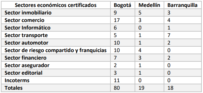 La abrupta distancia entre el número de certificaciones, por ejemplo, de ochenta en Bogotá, pasando a diecinueve en Medellín y dieciocho en Barranquilla, también obedece a la dinámica económica y a las exigencias de los actores comerciales para poder arbitrar disputas. La fuerza social de los usos que logra certificaciones en los sectores precisa el nivel de acciones económicas que se dan en consonancia con las agendas productivas de estas principales capitales, por ende, vemos que el sector más certificado en Bogotá es el comercial, en Medellín es el inmobiliario y en Barranquilla es el del transporte marítimo.