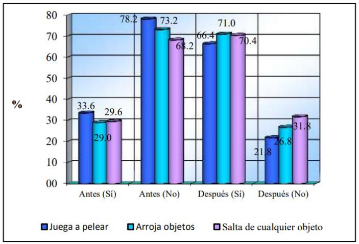 Se percibe que antes de observar el video la mayoría de los niños no jugaban a pelear como los superhéroes con sus compañeros utilizando golpes (78.2 %) y eran pocos quienes si lo hacían (33.6 %); sin embargo, esto cambia después, ya que la mayoría es ahora quienes sí juegan a pelear como los superhéroes utilizando golpes (66.4 %) y pocos son los ya no lo hacen (21.8 %); un buen número de niños antes de observar a los superhéroes en un video no arrojaba juguetes o utilizaba útiles escolares para golpear (73.2 %) y pocos sí realizan tal acción (29.0 %); después, la mayoría sí arrojaba los juguetes o utilizaban útiles escolares para golpear (71.0 %) y pocos ya no lo hacían (50.0 %), antes de observar el video la mayoría no Saltan de cualquier objeto (silla por ejemplo) imitando a su superhéroe favorito (68.2 %), y solo una minoría sí lo hacía (29.6 %), y después de observar el video la mayoría sí saltan de cualquier objeto (silla por ejemplo) imitando a su superhéroe favorito (70.4 %), y pocos son quienes no lo hacen (31.8 %). ( Reyes, 2017)