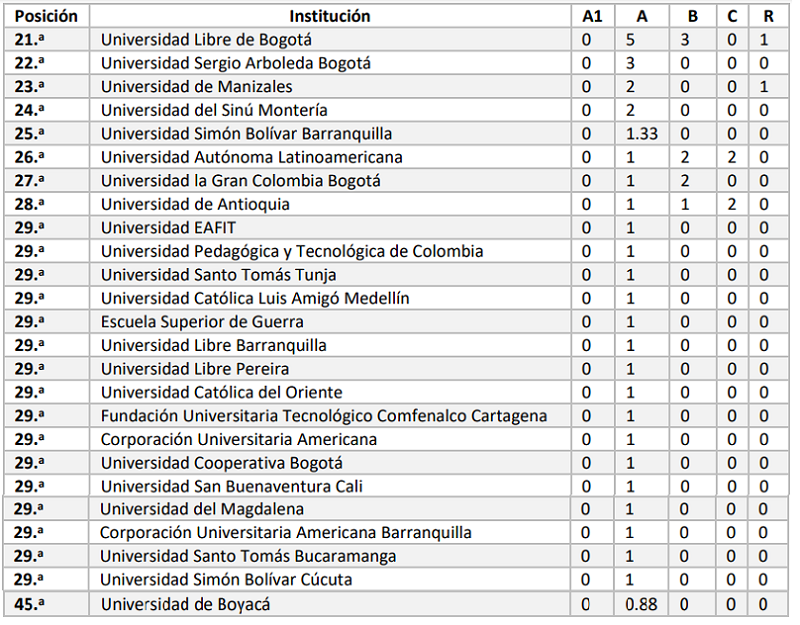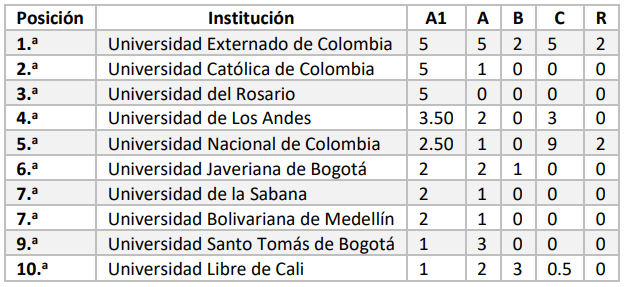 Sigue el programa de derecho de la Universidad de Los Andes [ 2] , ahora con la cuarta posición en el escalafón, con cuatro grupos de investigación en la categoría A1, aunque uno de ellos es compartido con la Universidad Nacional, a los que se adicionan dos grupos en la A y tres en la C. En la primera edición del ranking, la Universidad de Los Andes había ocupado el segundo lugar ( Milla, 2018), en la segunda edición quedó decimosexta con un fuerte descenso; desde entonces, no ha vuelto al podio. La Universidad Nacional de Colombia (acreditado), con su programa de derecho, es quinta en el ranking, pues consiguió en la convocatoria tres grupos de investigación en la categoría A1, como ya se dijo, uno compartido con la Universidad de Los Andes, al que se agregan nueve grupos en la categoría C y dos reconocidos. Con catorce grupos de investigación es la segunda institución de educación superior con más grupos en derecho. Su programa es, desde luego, el más importante del país entre las universidades públicas, desde el punto de vista del factor de la investigación. La Pontificia Universidad Javeriana (acreditado), en su programa de Bogotá, sexto en el ranking, sobresale con dos grupos de investigación en la categoría A1, dos en la A y uno en la B. El programa de derecho de la Universidad de La Sabana (acreditado), séptimo en el ranking, avanzó con dos grupos en la categoría A1 y otro en la A. Empatado aparece, también séptimo, el programa de derecho de la Pontificia Universidad Bolivariana de Medellín (acreditado), dueño de dos grupos en la categoría A1 y uno en la A ( tabla 1).