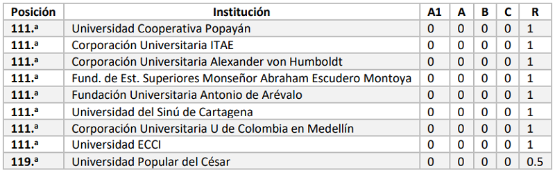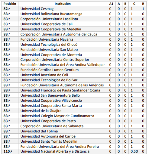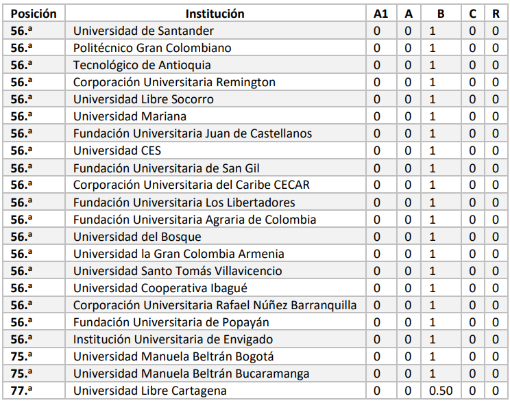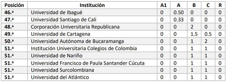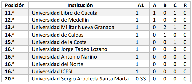 En las tablas en las que se presenta el ranking se identificará el número de grupos en cada categoría. Los grupos apenas reconocidos serán señalados con la letra R. Cuando exista un empate entre varios programas, al disponer de la misma cantidad de grupos en la que para ellos sea su categoría más alta, enseguida se dará una mayor calificación al que cuente con el mayor número de grupos en la categoría siguiente. En varios casos se encuentran grupos de investigaciones avalados por varias instituciones, evento en el cual se dividirá la unidad que representa un grupo por la cantidad de instituciones que la avalen, razón por la que el número de grupos de un programa puede aparecer fragmentado en decimales. Las instituciones que no avalaron grupos, aunque son mencionadas en los datos de Minciencias, no son tenidas en cuenta.