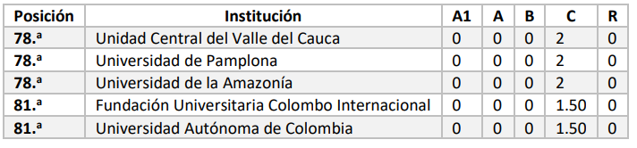 A continuación, la relación del escalafón de programas comprende a aquellos con presencia en la última categoría. Con dos grupos en la C aparecen: la Unidad Central del Valle del Cauca, la Universidad de Pamplona y la Universidad de la Amazonía. La Fundación Universitaria Colombo Internacional suma un grupo en la C por cuenta propia y otro también en la C compartido con la Universidad de Cartagena. Situación similar a la de la Universidad Autónoma de Colombia, con dos grupos en la C, uno exclusivo y el otro compartido con una institución que no es de educación superior ( tabla 6).