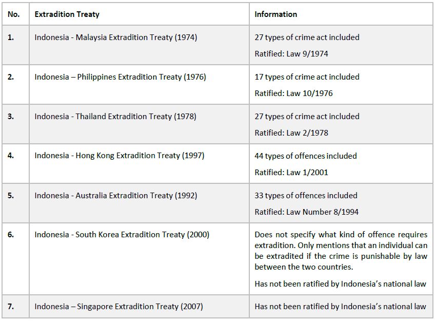 In practice, Indonesia has made seven extradition treaties in cooperation with several countries, two of which have not been ratified, as shown in Table 1 below.