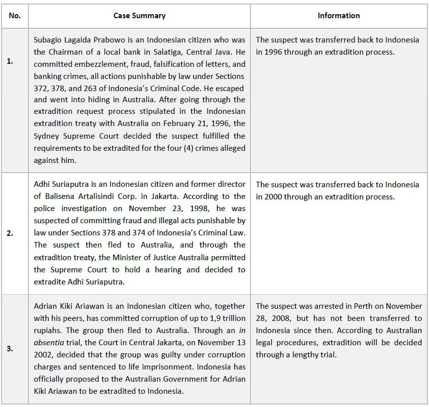 As shown by the case examples in Table 2, Indonesia has successfully cooperated with partner countries in the extradition process. Hiccups can only be found in the case of Subagio Lagaida Prabowo, a criminal who fled to Australia. The first request was made on November 23 by NCB-Interpol Indonesia to find and arrest suspects. The arrest was made at the Australian Federal Police in Sydney, followed by a request for extradition from the Indonesian Ministry of Law to the Australian High Court; unfortunately, in February 1995, the request was rejected because the Australian High Court found errors in the extradition request. The two suspects were arrested in December 1995, followed by a second extradition request, which the Law Department sent to the Australian Embassy in Jakarta. In February 1996, a Sydney judge agreed that the suspect was eligible for extradition to Indonesia. The length of the extradition process is a constraint visible from the previous examples, which took one full year from the time the application was submitted until the perpetrator was transferred to the requesting country.