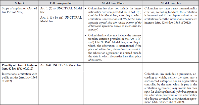 a. International character of arbitration proceedings (SNIA, Art. 62): The Arbitration Statute does not include the internationality criterion provided in article 1.3 (b) (i) of the Model Law, according to which, an arbitration is international if the place of arbitration, determined pursuant to the arbitration agreement, is situated outside the state in which the parties have their place of business. Moreover, the Arbitration Statute excludes the provision, provided in article 1.3 (c), according to which arbitration is international if "the parties have expressly agreed that the subject matter of arbitration agreement relates to more than one country". In addition, the Arbitration Statute contains a new internationality criterion, according to which, the arbitration is international if the dispute submitted to arbitration affects the international commerce interests. (SNIA, Art. 62 (c)) (Zuleta, 2013).