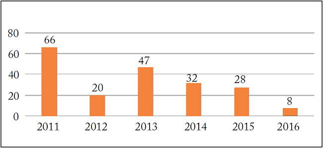 De la información presentada en la Figura 1, se puede apreciar cómo el mayor número de solicitudes de audiencias para la iniciación del proceso sancionatorio se presentaron en el año 2011, con 66 solicitudes. Así mismo, la Figura 1 indica que en el año 2012 esta cifra disminuyó considerablemente, al pasar de 66 a 20 solicitudes, resultado que concluimos se da por la entrada en vigencia del Estatuto Anticorrupción, expedido el 12 de junio de 2011, el cual, en su artículo 86, establece un claro procedimiento para la imposición de multas, sanciones y declaratorias de incumplimiento. Así mismo, se puede concluir que en el año 2016 se presentó el menor número de casos con tan solo 8 solicitudes aceptadas de las 11 presentadas; además, la Figura 1 evidencia que las solicitudes de incumplimiento vienen decreciendo desde el año 2013.