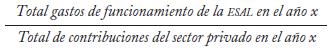 Dado que las contribuciones estatales a las entidades privadas sin ánimo de lucro pueden desplazar las donaciones provenientes del sector privado y reducir los incentivos para buscar financiación privada10, es recomendable tener en cuenta un indicador de eficacia del esfuerzo de la ESAL para con seguir contribuciones del sector privado: