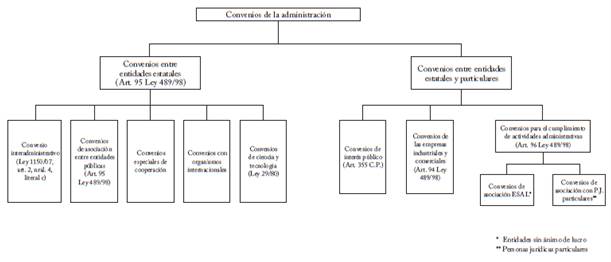 El convenio de asociación sin ánimo de lucro es una de las tipologías de los con venios de la administración. Resulta pertinente hacer mención de los demás tipos de convenios de que el Estado se vale para el cumplimiento de sus fines, sin pro fundizar en el tema, para no desviarnos del objeto de estudio. Como dos grandes vertientes, se encuentran: los celebrados entre personas jurídicas públicas, que son los llamados por el legislador contratos interadministrativos, y que la jurisprudencia asimiló a los convenios interadministrativos; y los celebrados entre las entidades públicas con particulares, convenios donde una parte es el ente público y la otra, el particular sin ánimo de lucro (Blanco, 2012).