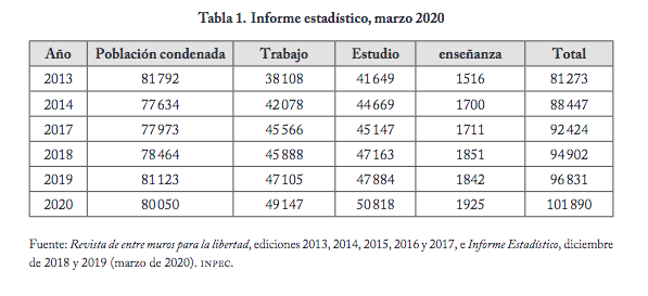 Se puede observar, con respecto a la redención, que en el año 2013 los cupos disponibles en trabajo, estudio y enseñanza son mínimos frente a la población condenada y se desprende que 519 sentenciados no pueden acceder al tratamiento penitenciario. En 2014, en vigencia de la Ley 1709, el fenómeno cambia y comienzan a sobrar cupos, como se observa en la tabla 1, lo que implica que la población imputada y procesada está teniendo acceso a tratamiento. Luego el cambio dado por la mencionada ley, en el entendido de que la redención de pena sea un derecho y no un beneficio, fue un avance en el sistema progresivo, dado que el 100 % de los condenados realizan alguna actividad y con ello algunos alcanzan el subrogado penal de la libertad condicional, amparados en que han alcanzado la resocialización, como en igual forma a los que están cumpliendo la totalidad de la pena, por habérseles negado en su momento el subrogado aludido (Ballesteros, 2015).