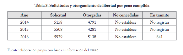 Ahora, analicemos a los privados de la libertad que están cumpliendo la totalidad de la pena por no alcanzar igualmente la resocialización y no beneficiarse de subrogado alguno, para el caso la libertad condicional (tabla 3).