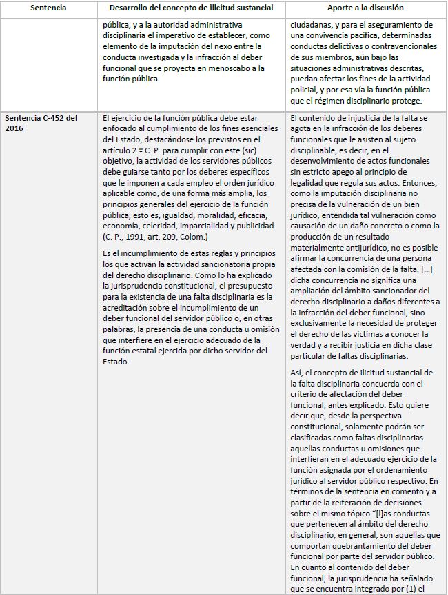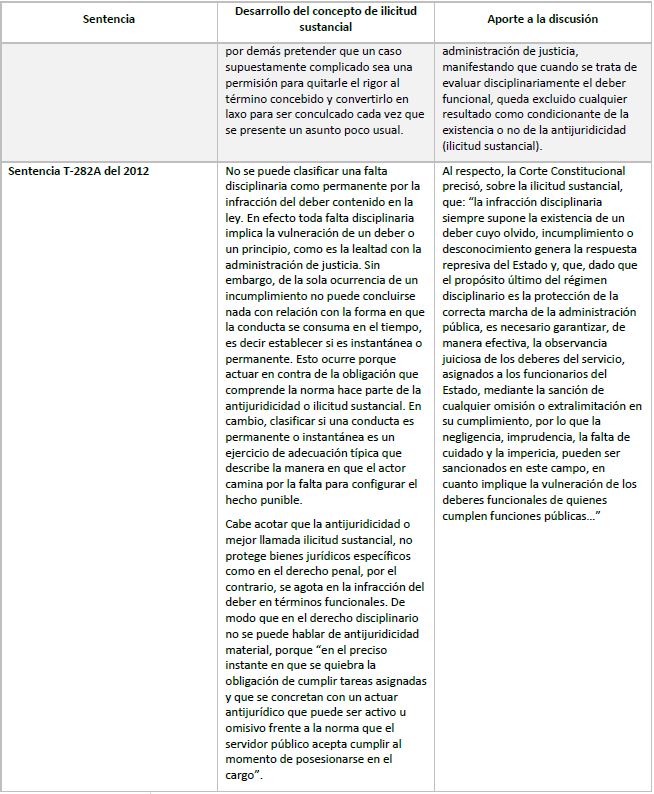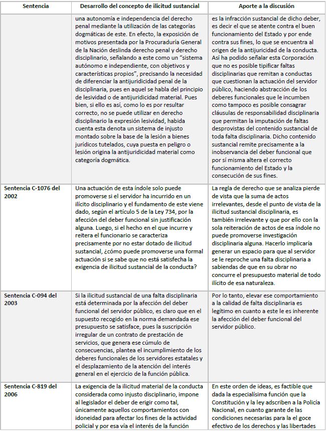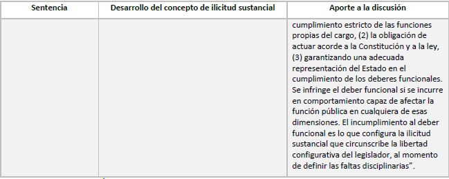 Terminado este breve recorrido por las sentencias más relevantes de la Corte Constitucional en control abstracto en materia disciplinaria que abordaran el concepto de ilicitud sustancial se pasará al siguiente punto.