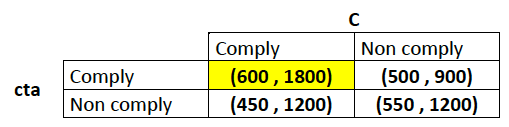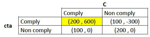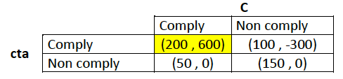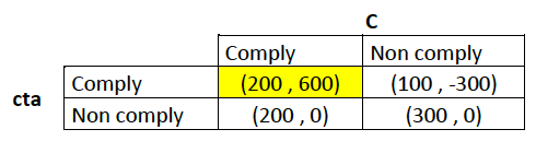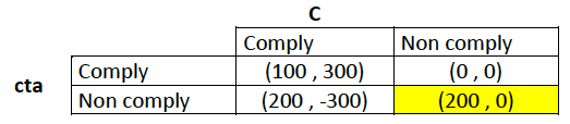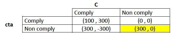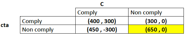 Finally, if both players decide to “breach,” neither will obtain a gain or loss from the goodwill and consequently, the CTR will receive 300 due to the payment they are offering to play this strategy. In contrast, the CP will receive 0.
