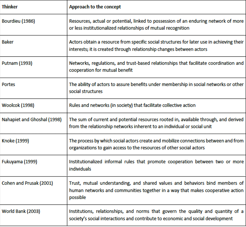 After reviewing the definitions of social capital, the norms or institutions that allow cooperation and reinforce the commitments acquired are at the core of the concept.